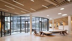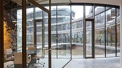 인테리어에서는 재료의 자연스러운 진정성이 완전히 매혹적입니다. 매우 높은 천장, 코어를 둘러싸고 있는 버섯 모양의 목제 서까래, 바닥, 천장, 기둥, 축에 목재를 일관되게 사용하여 마치 '나무로 만든 대성당'에 있는 듯한 공간감을 연출합니다. ". 1,280개의 개별 판유리로 만든 유광 알루미늄 파사드가 있는 건물은 공간의 가장 깊은 곳까지 자연광을 최대한 활용할 수 있습니다. 소음 감소에도 도움이 되는 투명한 분리벽은 1,000개의 워크 스테이션 중 거의 모든 곳에서 완벽한 경관을 제공합니다. 3.60m 높이의 파사드 모듈의 층 높이 윈도우는 자연 환기를 위해 열 수 있어 실용적입니다.