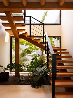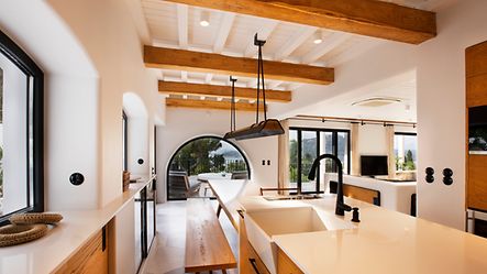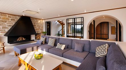 굴뚝 외에도 건물 전체가 바닥 난방을 통해 난방됩니다. 윈도우 시스템은 고품질 기술과 디테일을 고려하여 선택되었습니다. 차양막과 절연 프로파일이 통합된 안전 유리는 필요한 단열을 제공할 뿐만 아니라 해당 지역의 강한 바람과 강한 햇빛으로부터 보호합니다. 이는 에너지 소비와 전기 냉각 비용을 줄여줍니다 - 유리 면적이 65m2라는 점을 고려하면 상당한 이점이 있습니다. ASS 70 FD 폴딩 슬라이딩 시스템은 거실과 식사 공간을 발코니에 연결하고 레벨 문턱 덕분에 유동적인 전환을 제공합니다. 수처리 시스템은 기술적으로 매우 정교하며 건물의 지속 가능성에 기여합니다. 물은 지하수 우물에서 공급되며 식수로 사용하기에 적합하도록 처리됩니다. Cradle to Cradle 인증 AWS 65 윈도우 시스템도 지속 가능합니다. Cradle to Cradle 개념은 모든 물질을 폐쇄된 순환의 영양소로 시각화합니다.