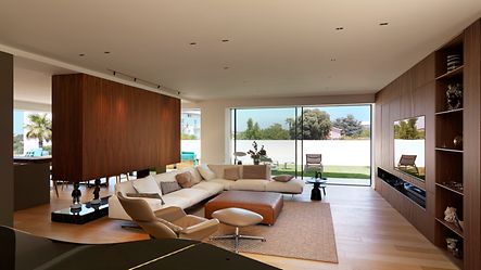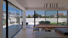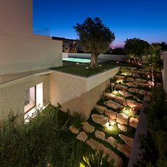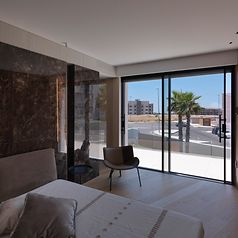 2층에는 수동으로 이동할 수 있는 오크 나무 패널이 뒤에 있는 방에 그늘을 만듭니다. 1층은 입구 층입니다. 두 개의 다리를 통해 도로에서 접근할 수 있습니다. 이 층에는 거실, 주방 및 침실이 있습니다. 슬림한 계단이 2층으로 이어집니다. 아이들을 위한 공간 외에도 작업 공간이 마련되는 곳이기도 하며 주요 특징은 큰 책장입니다. 넉넉한 옥상 테라스는 슬라이딩 도어를 통해 건물 전체 길이를 따라 열리는 전면 윈도우를 통해 접근할 수 있습니다. 1층에는 식사 공간이 있는 두 번째 주방과 터키식 목욕탕, 체육관, 야외 수영장이 있는 스파가 있습니다. 천장부터 바닥까지 내려오는 대형 파노라마 디자인 슬라이딩 도어를 통해 수영장, 야자수, 올리브 나무, 캐롭 나무를 자유롭게 조망할 수 있습니다. 특히 하이라이트는 부엌 영역과 정원을 매끄럽게 연결하는 멀리언이 없는 전면 유리 코너 솔루션입니다.