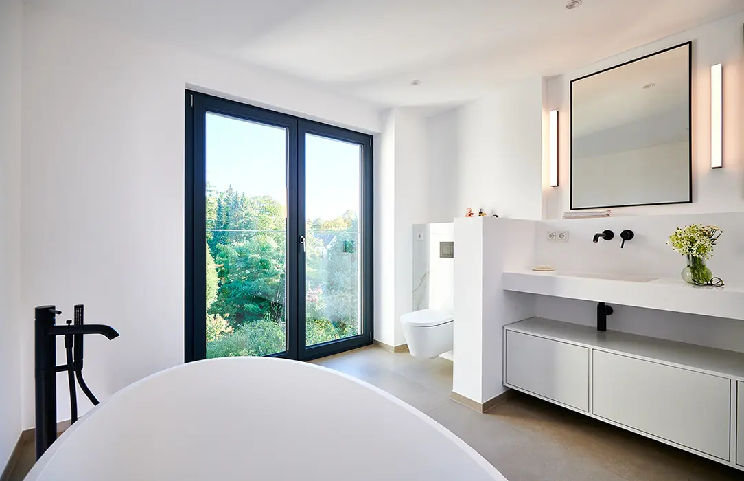 The bright bathroom upstairs has been furnished with a free-standing bathtub. Through the double-vent, floor-to-ceiling Schüco LivIng window combined with a glass safety barrier, you have an unobstructed view of the 50-metre-long garden.