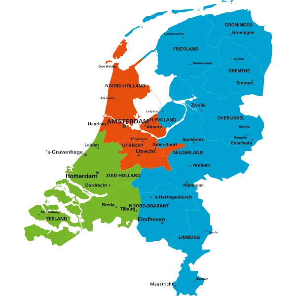 Op deze kaart ziet u de rayonverdeling van onze Area Project Managers. Elk gekleurd gebied geeft aan welke contactpersoon verantwoordelijk is voor die regio. Zo weet u altijd bij wie u met uw vraag of project terecht kunt.