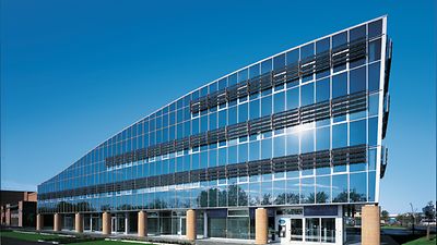 Een niet-geventileerde vliesgevel met Schüco BIPV-modules biedt statica, thermische isolatie, weersbescherming en geluidsreductie. De semi-transparante isolatieglasmodules hebben uitstekende Ug-waarden en kunnen conventionele beglazing vervangen. Ze integreren technisch en esthetisch, inclusief zonne-energieopwekking, voor een uniforme en creatieve gevel.