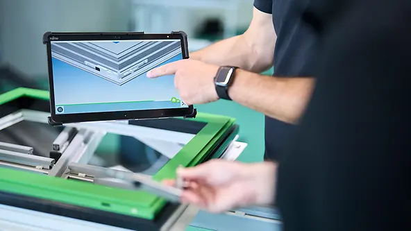FDC mobile gjør funksjonene til det stasjonære Fabrication Data Center fleksibelt tilgjengelig på verkstedet. Det robuste og sprutsikre nettbrettet er alltid ved din side med all produksjonsrelevant informasjon – enten det er på lageret, ved maskinen eller på byggeplassen