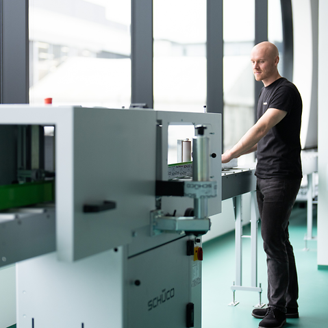 "Schüco Fabrication tilbyr maskiner av høy kvalitet, med utgangspunkt i verdiskapningen i produksjonen, for å sikre høy kvalitet. Takket være vår egne sammenrulling av profiler kan vi reagere fleksibelt og raskt på individuelle behov og tilby skreddersydde løsninger. Takket være PFA tilbyr vi dessuten foliering av profiler for overflatebeskyttelse under transport og installasjon, slik at produktene dine kommer frem i perfekt stand."