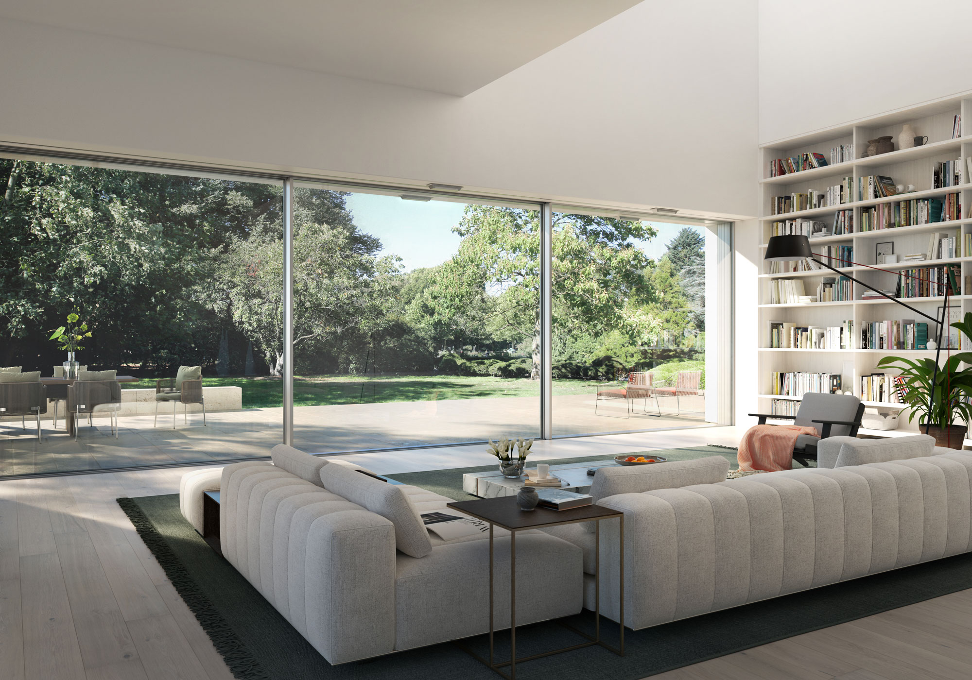 Slanke og transparente skyvedører i Schüco Panorama Design gir videst mulig utsikt. De rammeløse skyvedørene, som er innfelt i vegg, tak og gulv, har maksimalt glassareal og minimale rammer. Et høydepunkt i enhver bygning!