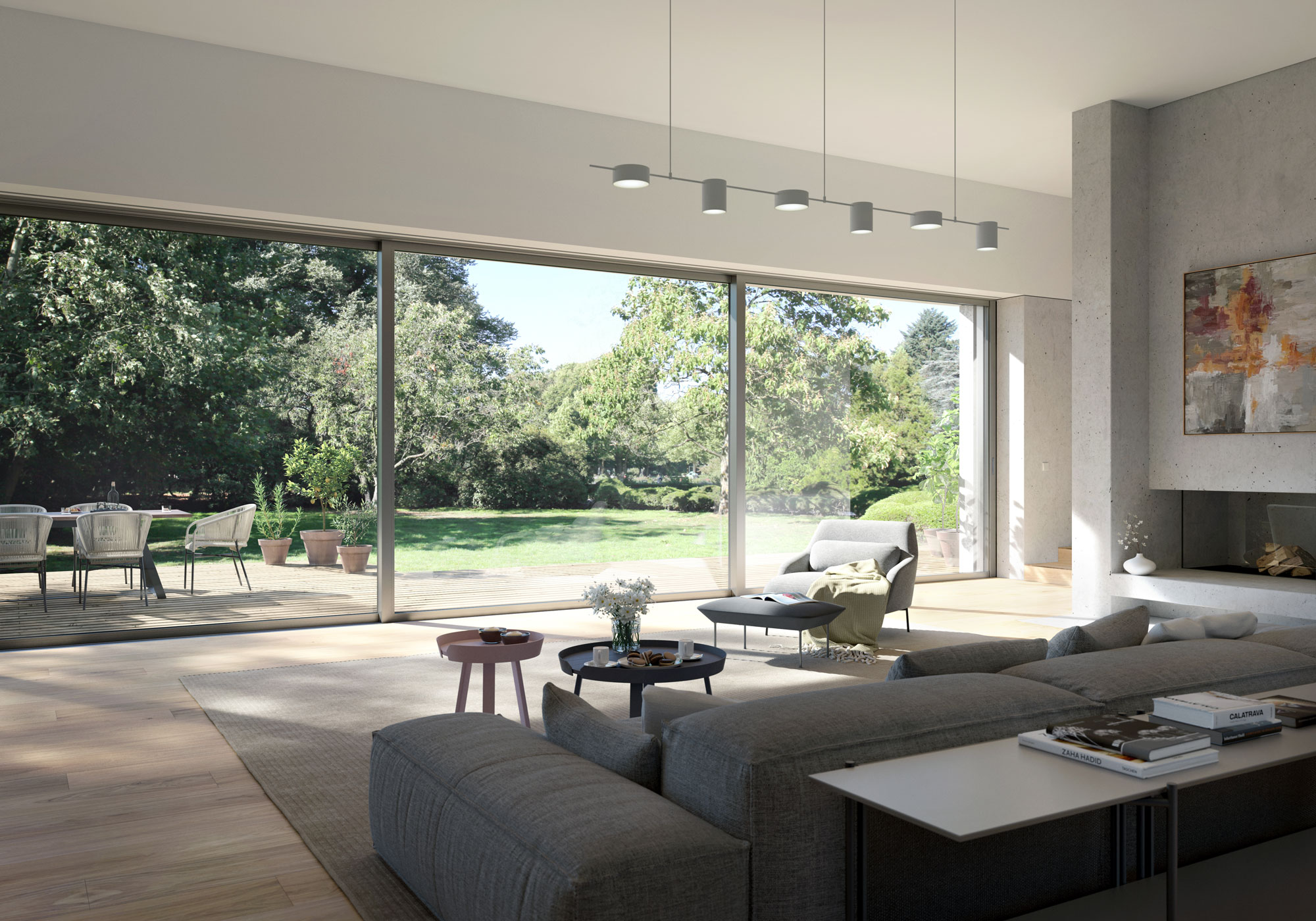 Soluções de fachada transparentes e portas de correr representam um estilo novo e minimalista contemporâneo que oferece aos designers e utilizadores mais do que nunca. Nas nossas portas de correr, grandes unidades de vidro e larguras de face mínimas são tão importantes para nós como um desenho linear.