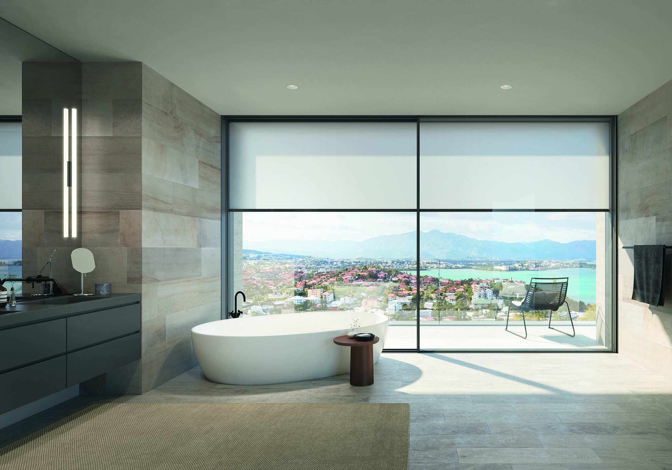 To provide sufficient sun shading and glare protection, the AS PD 75.HI Panorama Design sliding system can be combined with the Schüco AB ZDS sun shading system.