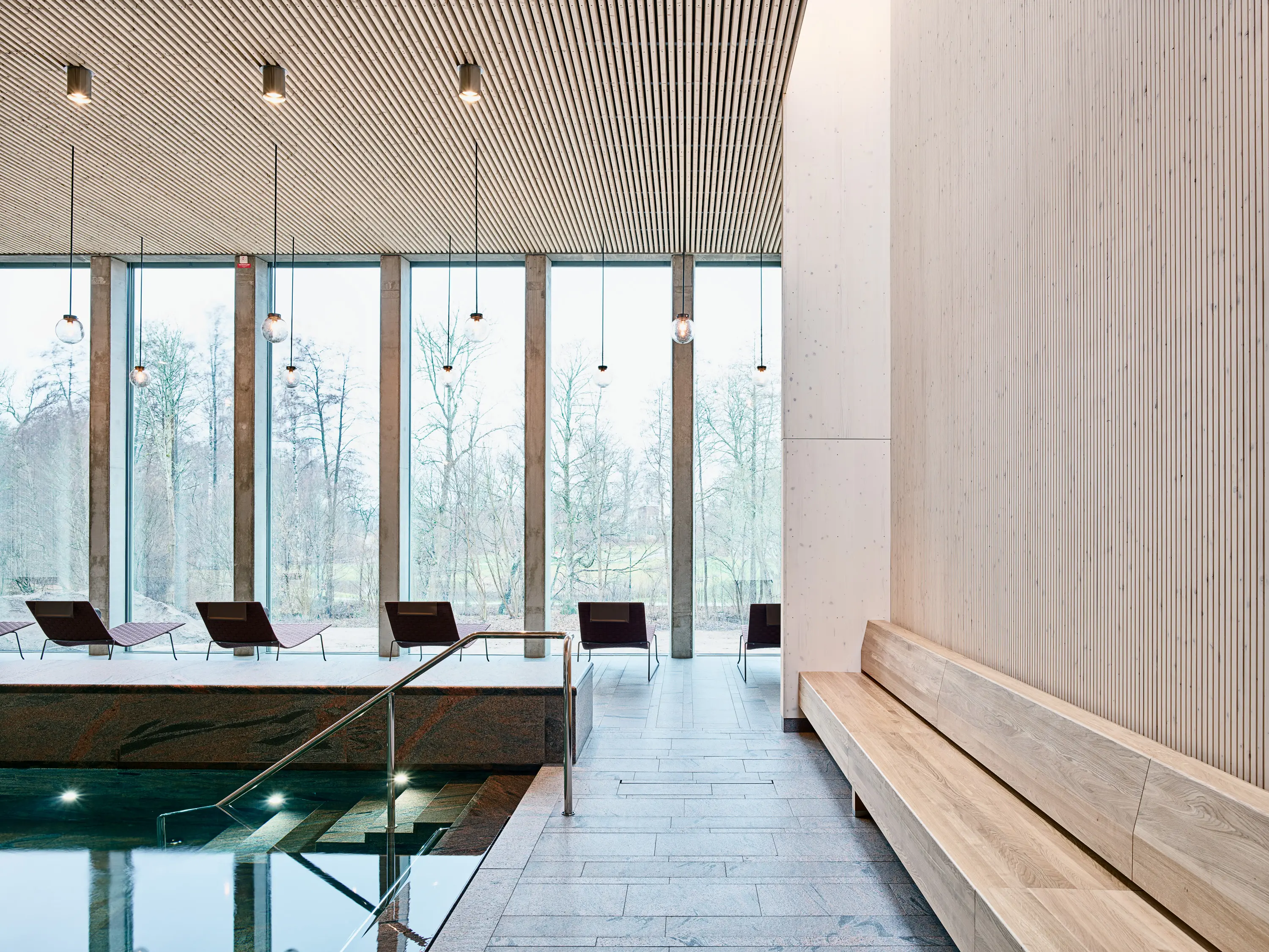 Njutningen ligger i nuet och tystnaden på Andrum Spa i skånska Höör. Schüco bidrar till den rofyllda miljön med bland annat resliga glaspartier i poolrummet.