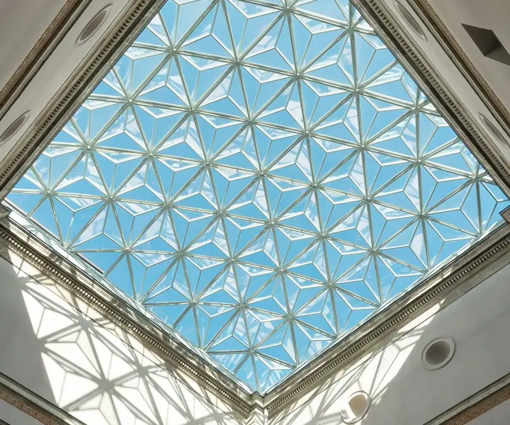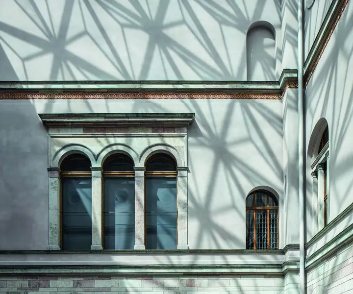 Uppgiften att renovera Nationalmuseum bestod till stor del i att återta möjligheterna till dagsljus och utsikt, släppa in frisk luft. Att åstadkomma förändring med hänsyn till arkitekturen och de kulturhistoriska värdena. Länge ansågs dagsljus utgöra ett hot mot konstverken och förnimmelsen av dem men i takt med att vi har lärt oss mer om hur ljuset egentligen påverkar målerier och bidrar till att förhöja upplevelsen, utgör det nu ett allt viktigare inslag i museer runt om i världen. Dessutom har teknikutvecklingen tagit milslånga steg och idag finns många olika typer av multifunktionella glas med smarta funktioner på marknaden. De tidigare glastaken på Nationalmuseum tjänade i första hand som väderskydd medan de nya, specialdesigande konstruktionerna, utgör en viktig del i moderniseringen genom att addera både mycket och rätt ljusinfall samt bidra till en behaglig akustik. Formen är både nytänkande och 1800-talsmässig vilket visar prov den fantastiska finkänslighet med vilken renoveringen har genomförts. Glasen har en lågemissionsbeläggning som ger inbyggt solskydd och släpper in rätt mängd ljus samt reducerar solvärmen varma sommardagar. De har sammanfogats på ett sådant sätt att de dämpar ljudet i glasgården under. Den trestegstätade strukturen har också inbyggt dränagesystem. Konstruktionen är en projektanpassad lösning som byggts upp i fullskalig mockup och testats i Schücos ackrediterade testanläggning i Bielefeld, Tyskland.