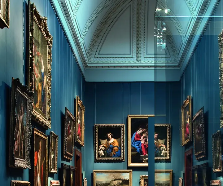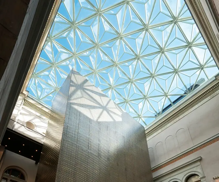 ”Nationalmuseum har genomgått en stor uppdatering. Nya system för klimat och säkerhet, återställda fönster och så har muséet återfått två ljusgårdar. Vänd ögat mot himlen och du ser tunna glaskupoler där varje glas-fält är byggt som en flack pyramid. Det är skirt, sirligt och doftar artonhundratal, samtidigt som det är modernt, high-tech och ytterst funktionellt. En överglasning kan ibland ge en bullrig miljö. Kupolen är en bra geometri för att med tunna delar bära stora laster, men den kan också återkasta ljud som ett brännglas förstärker värmen till en öppen låga. Det är här pyramidformen kommer in. De reflekterande glasytorna har var och en unik vinkel som sprider ut ljudet istället för att koncentrera det. När det når väggarna är de dessutom absorberande. Det är de grått avfärgade väggarna som med sina porer sväljer ljudet och återger ett milt, ofärgat ljus till utställningssalarna."