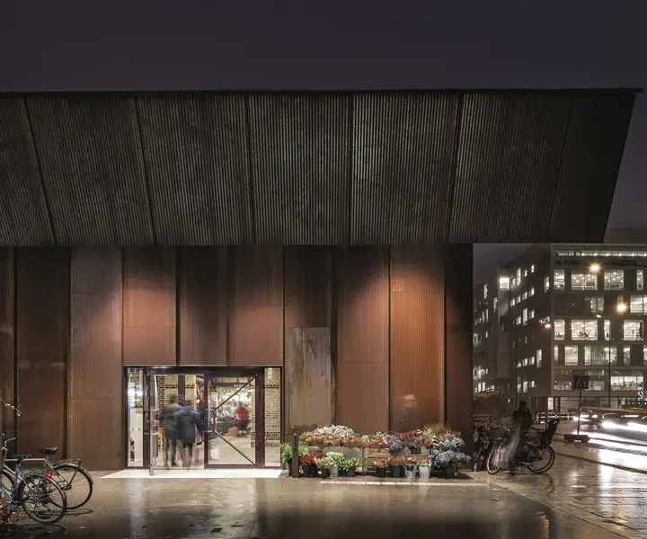 I ett tidigt skede av processen omfattade projektet ursprungligen endast den befintliga längan men med tiden uppstod en ambition om att bygga ytterligare en parallell huskropp. En dagvattenkulvert satte dock stopp för den tilltänkta utbyggnaden och idag består Malmö Saluhall istället av en knäckt tillbyggnad. De två huskropparna skiljs åt av en modern glasslits i både tak och ytterväggar, en vacker kontrast till teglet från förra sekelskiftet och det rostiga stålet. Här kom Schücos smidiga och smala glasfasad FWS 35 PD väl till pass då den fungerade utmärkt tillsammans med de renoverade fönstren i gjutjärn. Arkitekten Joakim Lyth berättar att man ville ha ett glasparti som skulle på- minna om gamla smidespartier. Den endast 35 mm smala profilen ger fasaden en slimmad dimension i kontrast till det robusta teglet samtidigt som profilen på ett elegant sätt smälter in i huskroppen. Glaspartierna tillför även ett ljusinsläpp som höjer saluhallens atmosfär.