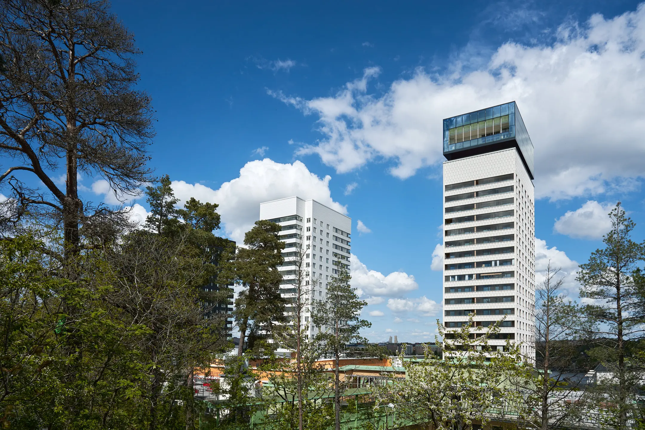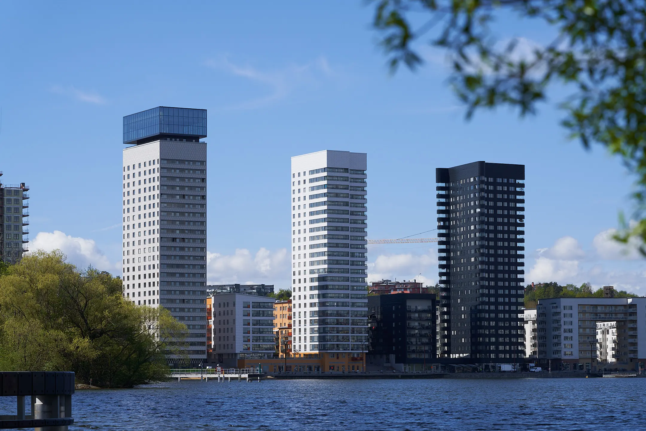 Just Kajplats 6 skiljer sig från de andra tre höghusen med sin ”krona”. Topprestaurangen sticker upp med sin helglasade fasad och gör därmed huset till det högsta på Liljeholmskajen.