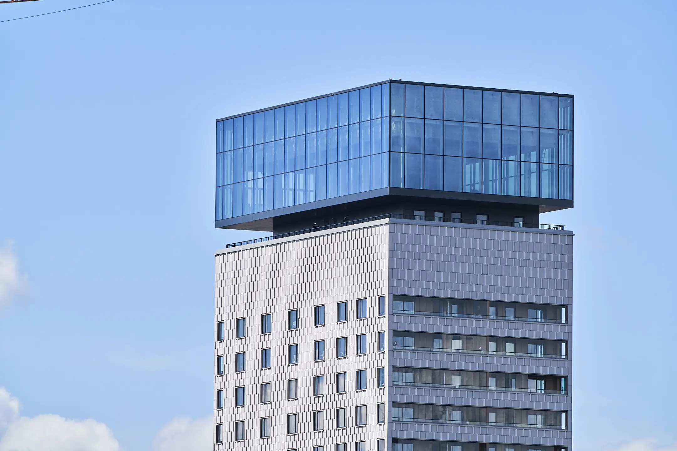 – Vi parerade detta genom val av system och infästningar, och vi tog upp större delar till taket för att därifrån lyfta dem på plats för att få så kort lyfttid som möjligt. Anslutningar som ska göras utvändigt är också en utmaning, eftersom vi inte kan jobba på utsidan på 90 meters höjd, men även det lyckades vi lösa redan innan huset blev tätt, säger Anders Summanen.