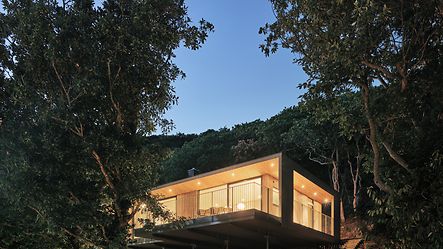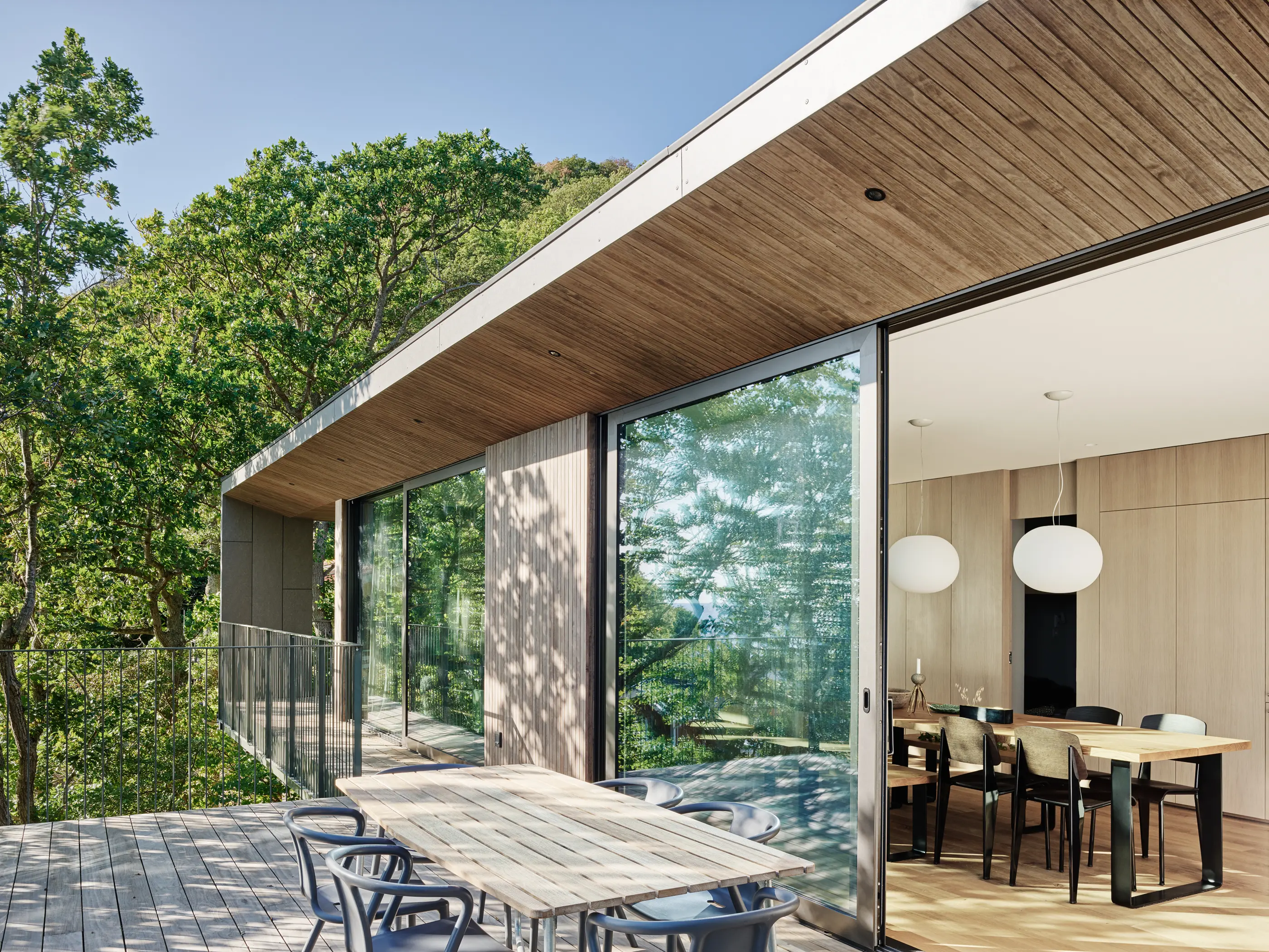 Tre skjutdörrspartier längs med hela husets längd ger direkt tillgång till havet, solen, himlen, vindarna och trädens sus. Här uppe bland trädtopparna finner husägarna sinnesro, en tvåbarnsfamilj från Lund.