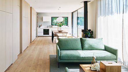 Entrén nås via den stora terrassen som sträcker sig längs med två av husets fasader. Uteplatsen vetter ut mot Kattegatt. I horisonten Själlands nordöstra kustlinje. Innanför terrassen en tio meter lång och fem meter bred yta med golvplank i ek. Ett kombinerat kök och vardagsrum med hisnande utsikt, tryggt skyddat av stora glaspartier med smala profiler. Det handlar om 48 mm tjockt treglas med u-värde 0,9 och inbyggd solskyddsfunktion för att reducera värmen. Glasen väger 250 kg styck och sträcker sig ända upp till takets skärning, en utmanande millimeteranpassning för de fyra montörerna från