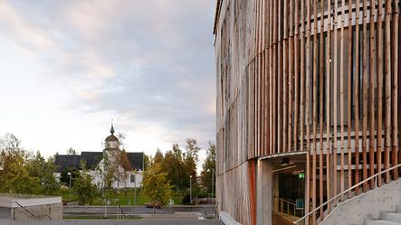 Den lärkbeklädda fasaden går i vågor som ger både bredd och djup. Trä gifter sig väl med glas och metall som förstärker den ombonade träkänslan. Tanken var först att använda trä genomgående, även invändigt, men fick ge vika för en funktionell betongkonstruktion som ger färre pelare och därmed bättre parkeringsmiljö.