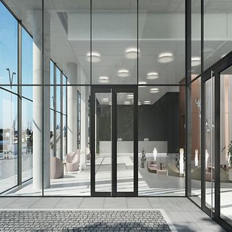 Schüco AD UP (Aluminium Door Universal Platform) dörrsystem kombinerar funktionell säkerhet med modern design av hög kvalitet. Oavsett om det är en stilren ytterdörr eller en ofta använd kommersiell entré ger den speciella konstruktionsprincipen med en 5-kammars profilsammansättning både stabilitet och alla tekniska förutsättningar för ett intelligent dörrsystem.