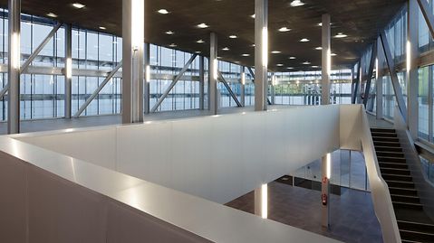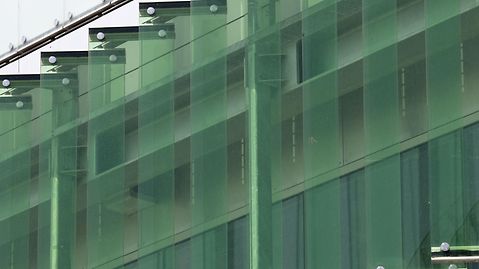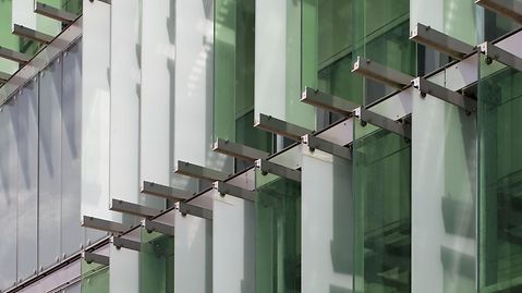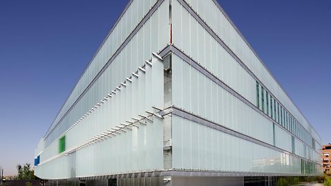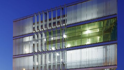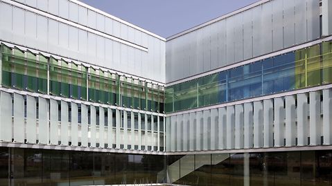 The office building of the National Institute of Social Security (INSS – Instituto Nacional de la Seguridad Social) is situated in northern Granada. With its angular shape which is reminiscent of a boomerang, it almost completely covers the triangular plot. The representative building, which is oriented towards the three surroundings streets, has a fascinating vertical dimension and contributes significantly towards shaping the newly created cityscape. A double-layer glass skin envelops the three-storey building. The inner façade with its sound reduction glazing minimises the noise pollution from the three adjacent streets and has low thermal emissivity. The outer layer, made from vertical, active, laminated glass louvre blades from the Schüco ALB system, has green, blue or yellow intermediate layers in some sections, which lend the building its characteristic appearance. According to the position of the sun and the data from a weather station equipped with light and wind sensors, a piece of software automatically controls the exact position of the louvre blades. These optimise the amount of natural light penetrating through, thereby reducing the direct radiation from the relentless sun in southern Spain and the heat load on the inside. Adequate space between the louvre blades nevertheless ensures a good supply of glare-free natural light. The twin-wall façade also has a significant influence on the energy balance of the building, as it helps to lower the operating costs for air conditioning. The upper floor, which projects out by 17 metres to the south, creates free space on the ground floor which is sheltered from the sun and rain. The main entrance to the generous foyer is located here and houses both the waiting zone and service area. Additional office space is located on the upper floor. Depending on the time of day and the weather conditions, the unusual shape and the constantly changing louvre blade façade give the administrative building a different appearance from every angle, thereby injecting life into the district.