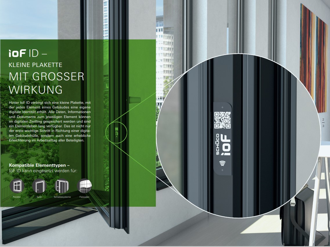 Med Internet of Facades och IoF ID förvandlar Schüco fönster, dörrar, fasader och skjutsystem till komponenter i det digitala byggnadskuvert. Varje element i en byggnad får sin egen digitala identitet av det lilla märket. All data, information, dokument och servicemeddelanden för ett element lagras på det och är tillgängliga under elementets livstid. IoF ID kan användas på aluminium, plast eller stål och kan även eftermonteras.