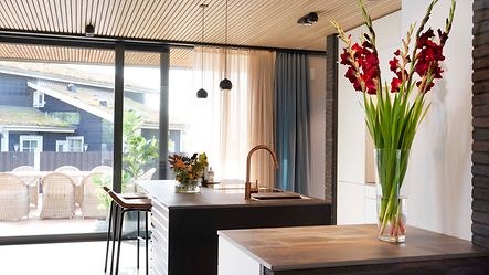 – Vi vill ha så mycket sikt som möjligt. Vi har stora skjutpartier i vardagsrum och kök, i det friliggande kontoret och i attefallshuset, i trapphuset, dotterns sovrum och i badrummet. Vi valde Schüco för att det står för kvalitet. Profilerna är tunna och skapar en snygg inramning av utsikten. Glaspartierna är dessutom ljudisolerande. Det är väldigt tyst här även om det piskar på ordentligt ute med regn och blåst, förklarar Johan.