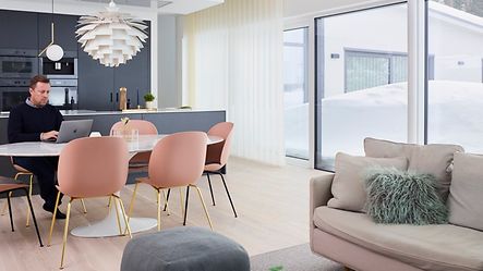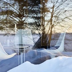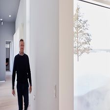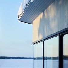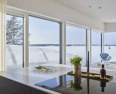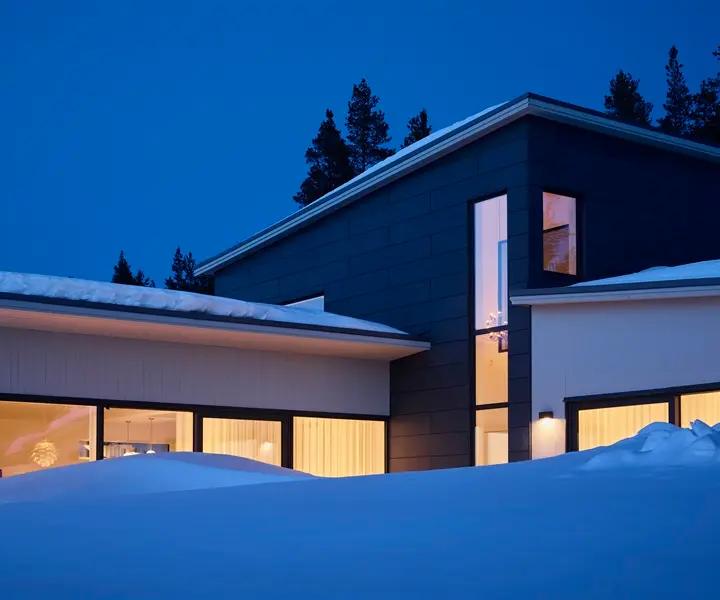 Stora glaspartier från golv till tak fullkomligen raderar ut gränsen mellan ute och inne. Skjutdörrar gör det enkelt att flytta utomhus så snart vädret tillåter. Glasfasader och fönster i olika format maximerar ljusintaget som om vintern kommer från den gnistrande snön och månskenets ljus i polarnatten och om sommaren från midnattssolen som färgar himmel och jord i röd-gula nyanser. Kontakten med naturen är genomgående för hela huset, så även de gedigna materialvalen som ger ett hållbart och underhållsfritt boende.