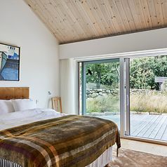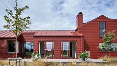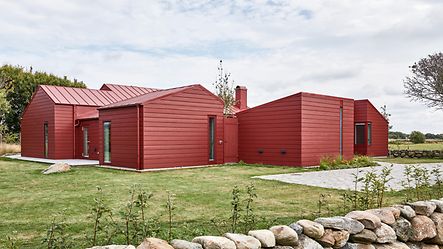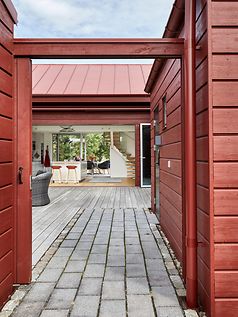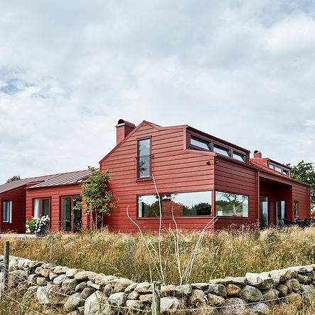 På vackra Getterön utanför Varberg ligger detta unika hus placerat mellan en slingrande bilväg och öppna fält. Huset vänder sig från vägen och öppnar upp sig inifrån samt mot de omgivande fälten. Det drar tankarna till en klassik svensk ladugård med röd fasad, rött tak och röda detaljer.