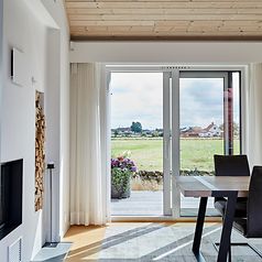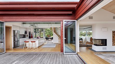 Då skjutdörrar, vikdörrar samt dörr- och fönsterpartierna till detta projekt krävde sina skräddarsydda lösningar kontaktades Schüco-partner Karlsson & Dahl som tillverkar och saluför Schücos produkter lokalt i Varberg. Med deras breda expertis och hantverksmässiga kunskap kunde de enkelt leva upp till kundens specifika önskemål om kulör och lösning. Aluminiumprofilernas högt kvalitativa egenskaper lämpar sig dessutom väldigt väl till västkustens hårda klimat med väder, vind och salt i luften.