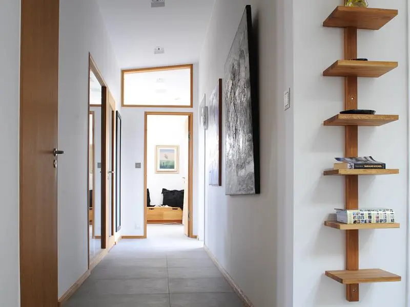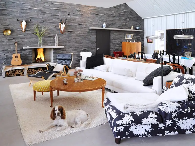 Huset domineras av ett stort allrum med en imponerande takhöjd på upp till sex meter. Rummet rymmer vardagsrum, kök, matsal och musikrum. AnnCharlott antyder att det var drömmarna om att få inreda en lada som förverkligats. I förlängningen av entrén leder en glastrappa upp till en mindre övervåning och den stora terrassen med utsikt över havet och skogen. Trappans steg tycks sväva i luften.