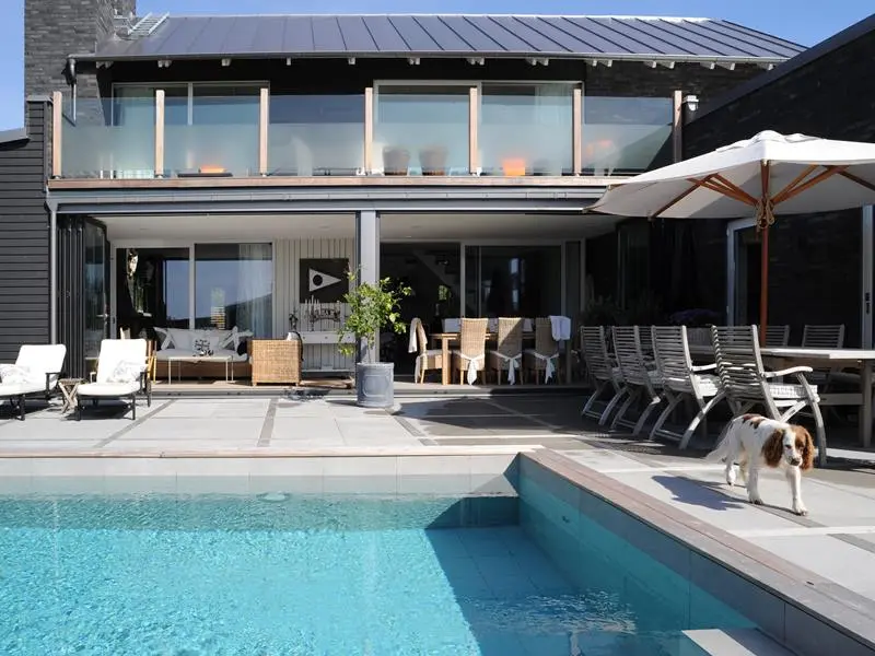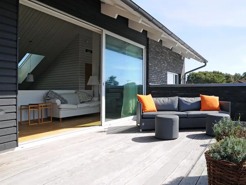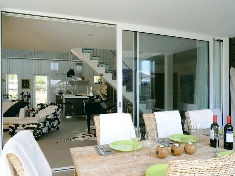 AnnCharlott pekar på de stora vikpartierna som kan öppnas mot pool och trädgård, och som försvinner in i väggarna när de viks. Det väl tilltagna uterummet suddar ut gränsen mellan ute och inne. Här går det att sitta en kulen höstkväll likaväl som på en varm sommardag. Uterummet är riktat mot syd och väst för att möta naturen och behålla solljuset så länge som möjligt. Stora glaspartier avgränsar uterummet gentemot allrummet om så önskas. På många områden är skillnaden till parets gamla fyravåningshus med många rum i Halmstad paradoxal. Villan i Vilshärad står för ett behagligt boende. Inte minst Schücopartierna gör boendet bekvämt. Även trädgården är skapad för att vara lättskött och underhållsfri.