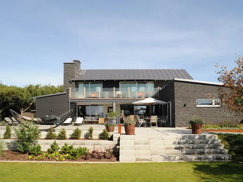 Det antracitgrå stenhuset sluter sig mot gatan och öppnar upp sig mot naturen, mot den fyra km långa sandstranden med mjuka sanddyner, och dess bakomliggande vindpinade tallar och mosstäckta björkar, som ingår i Haverdals vackra naturreservat. En liten grind på baksidan av huset leder direkt in i naturreservatets södra del och vindlande stigar.