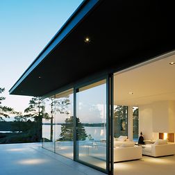 Med utsikt över bukten och kvällssol i väster. Arkitekt John Robert Nilsson har utmanat formen och storleken på glaspartierna och använt energieffektiva glasfasader, fönster och dörrar för att låta inne och ute flyta samman i harmoni.