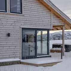 Stugan ligger i ett område i de norska fjällen där byggnader måste tåla ett hårt klimat och stora mängder snö. Det är då naturligt att tänka sig att en skjutdörr – och framför allt ett öppet hörn – är en teoretisk lösning som inte går att förverkliga. Men stugan på Kvamskogen är ett praktexempel på hur det till synes omöjliga kan göras möjligt med rätt produkter, kreativa sinnen, bra planering och lite mod.