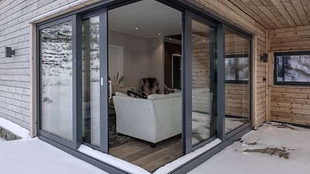 Mitt i ett fält av norska "hytter" vid Kvamskogen hittar vi en stuga som sticker ut från de andra. Man kan inte se det framifrån, men på baksidan, som vetter ut mot ett orört landskap, har konventionella skjutdörrslösningar utmanats. Skjutdörrar väljs ofta för att sudda ut gränsen mellan inne och ute. Här har det tagits ett steg längre och kombinerat två skjutsystem från Schüco i i ett hörn.