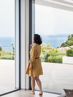 Presne to je prípad vily na iónskom ostrove Zakynthos. Túto budovu si však nemožno pomýliť s kostolom alebo statkom, a to ani zďaleka. Je to vila s dvoma úrovňami na úzkej náhornej plošine na kopci s úchvatným výhľadom na Iónske more. Biele omietnuté plochy, veľkoformátové zasklenie a stena z prírodného kameňa ako nosná časť spájajú pevnú konštrukciu s ľahkosťou a eleganciou modernej architektúry. Celoplošné zasklenie pomocou profilov s minimálnou pohľadovou šírkou a bez rušivých rukovätí umožňuje maximálne zorné pole zo spacích a obývacích priestorov a kúpeľní. Nová vila ožíva súhrou svetla a tieňa. Pergoly poskytujú protislnečnú clonu a tienenie. Posuvné dvere Schüco umožňujú zlúčenie interiéru a exteriéru a obyvateľom poskytujú pocit slobody. Takto to pokračuje po celý rok, pretože vila je navrhnutá aj ako útočisko v zime. Architekt sa preto osobitne zameral na tepelnú izoláciu a zvukovú izoláciu a rozhodol sa pre posuvné dvere Schüco Panorama Design. Podlahový systém poskytuje ďalší komfort tým, že sa v zime kúri a v lete ochladzuje.