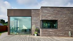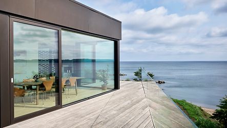 Rodina si vybrala zábradlie vyrobené z bezrámového bezpečnostného skla pre terasu, takže tam nie sú takmer žiadne viditeľné prekážky vo výhľade. Veľké posuvné dvere a sklenené plochy umožňujú, aby exteriér a interiér splynuli do jedného celistvého priestoru, celku.