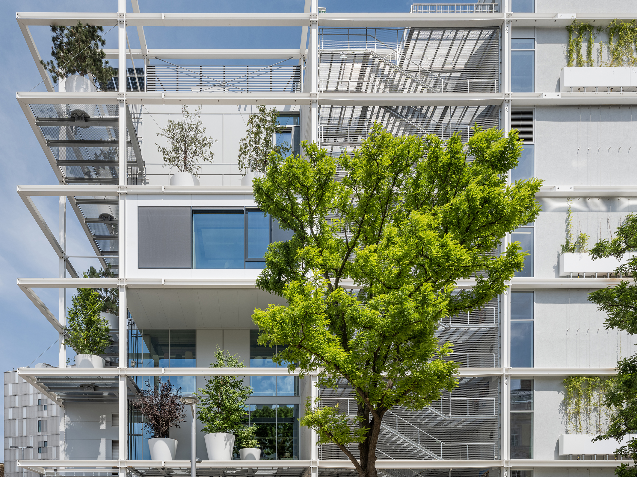 A 4.50 m deep steel framework surrounds the newbuild on all sides like a series of shelves. Emergency exit staircases, open, tree-lined balconies and oriels with large glazed fronts are integrated into it. For the façades, the architects opted for the Schüco FWS 50.SI mullion/transom system.