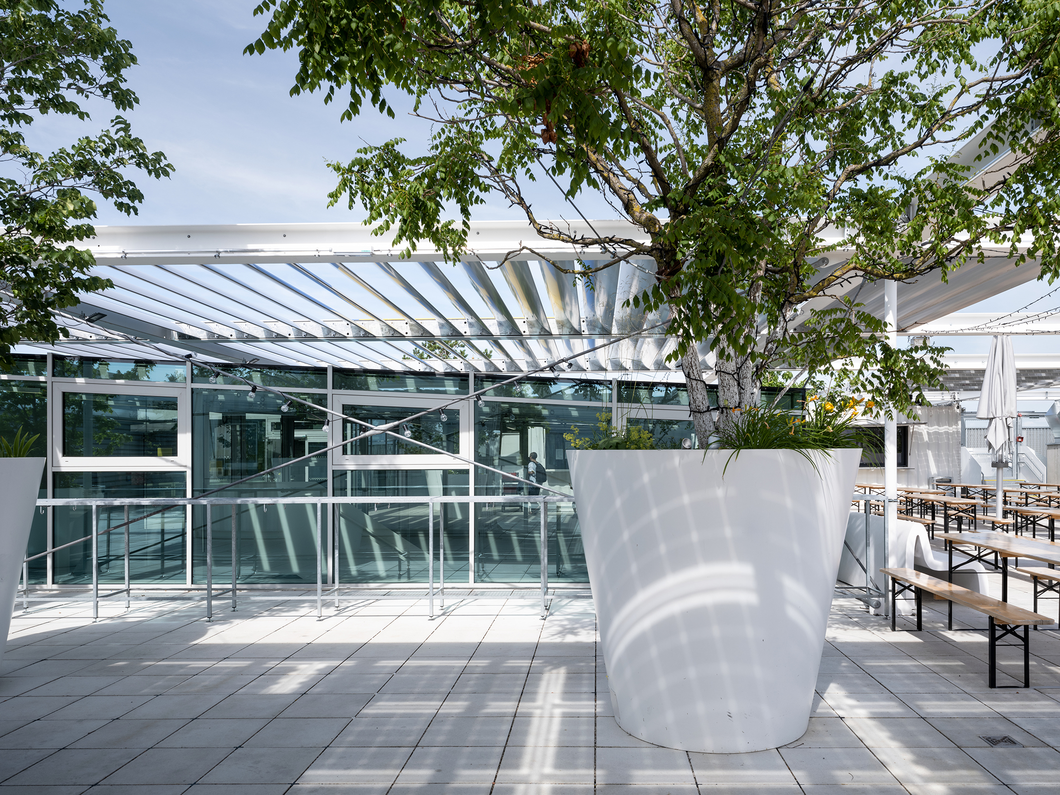 The roof exit above the atrium is enclosed in glass. The Schüco FWS 50.SI mullion/transom system was used here too.
