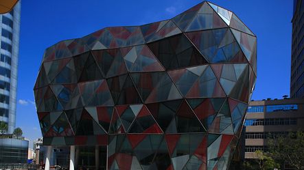 The partially elevated building is very conspicuous due its extraordinarily shaped outer skin. Large triangular glass units, which consist of differentcolored panes, make the building look like a work of art; an exhibition piece. In the interior of the building, the offset story levels and the unusual façade structure create astonishing spatial impressions and views outside.