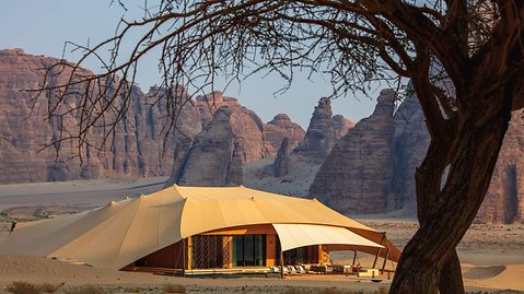 Since 2021 tourists have been able to experience top-of-the-line camping near the oasis city of al-'Ula in west Saudi Arabia. Just 15 km from the UNESCO World Culture site of Hegra is a sprawling hotel complex of 47 suites with a luxury spa, infinity pool and two gourmet restaurants.