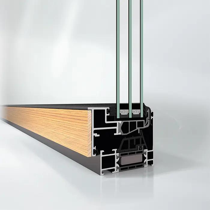 Schüco AWS WoodDesign available in the following oakwood versions: Natural (shown in image), Pure, Walnut, Chocolate, Gris Beige, Savanna and Super White. Other surface finishes are available on request.