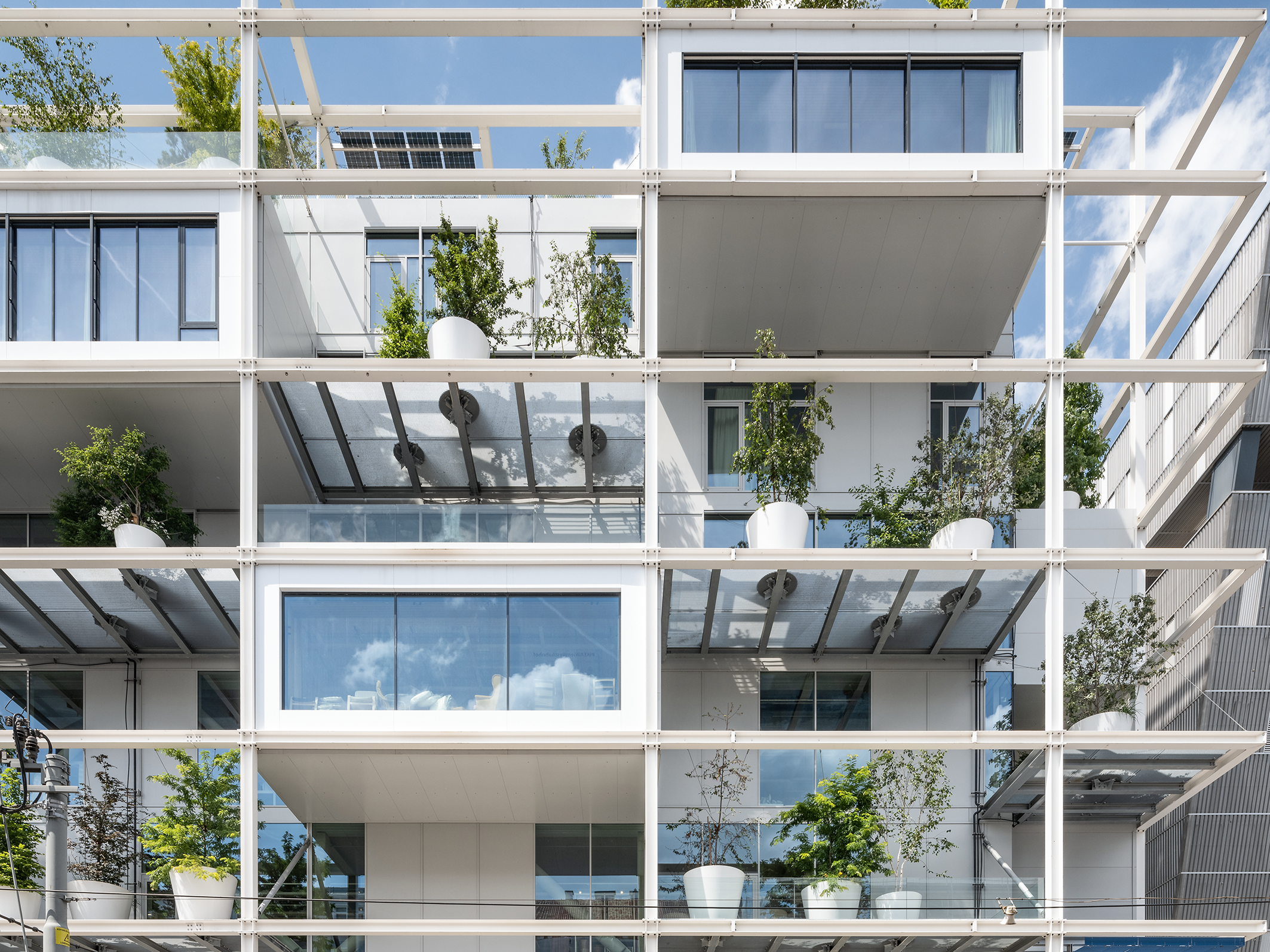 A 4.50 m deep steel framework surrounds the newbuild on all sides like a series of shelves. Emergency exit staircases, open, tree-lined balconies and oriels with large glazed fronts are integrated into it. For the façades, the architects opted for the Schüco FWS 50.SI mullion/transom system.