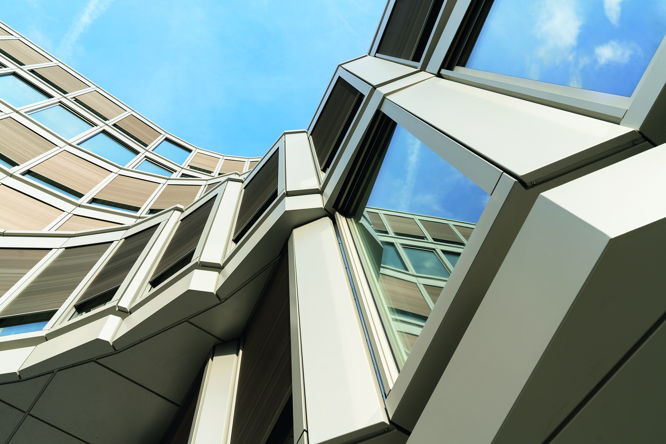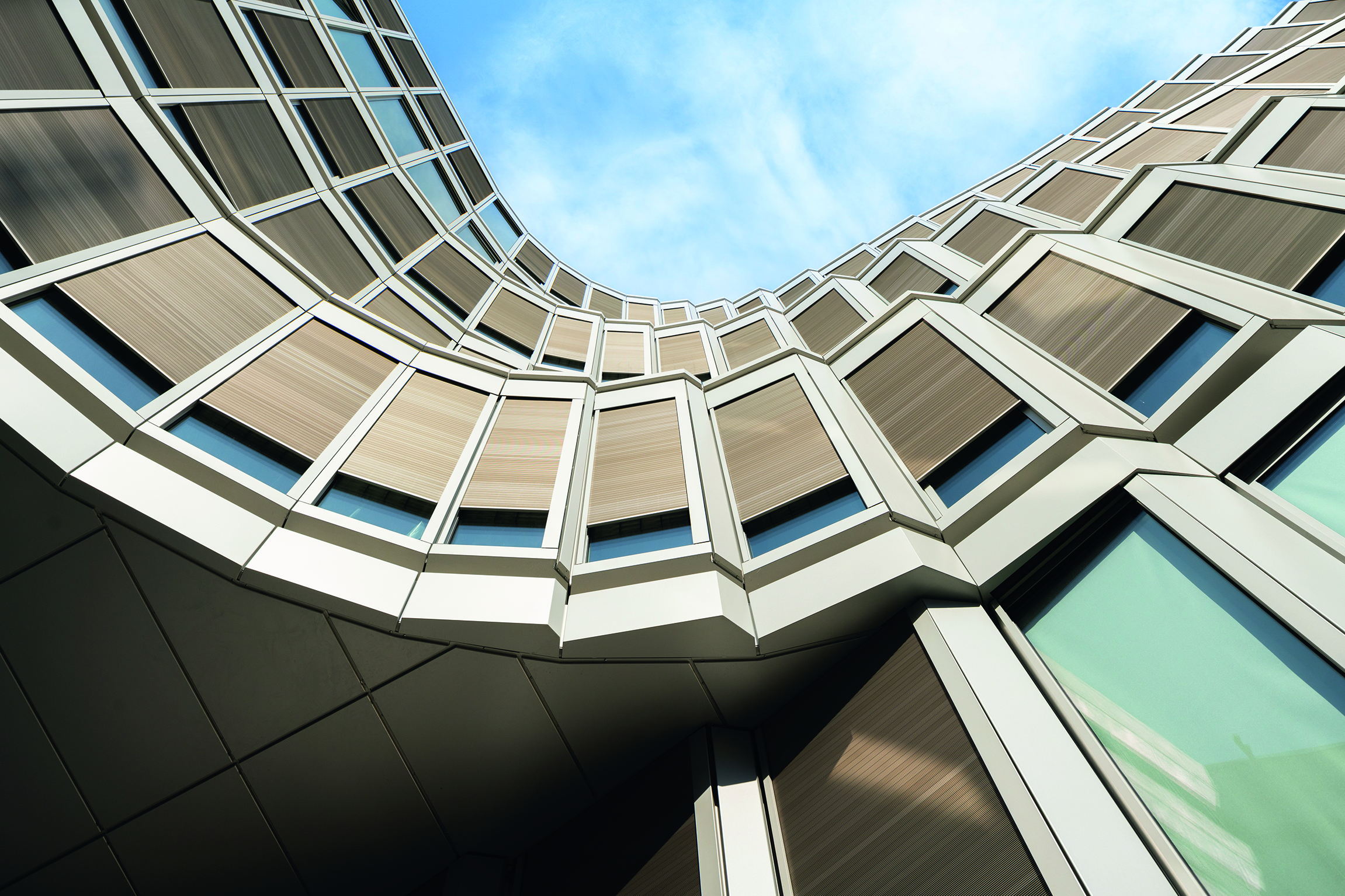 The electrically-operated, system-integrated Schüco Integralmaster glare protection along with the external Schüco CSB sun shading on rollers ensure that the workspaces remain free from glare and are adequately shaded.