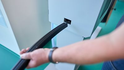The gasket cutting machine GP 100 by Schüco is the compact cutting device for an efficient and process reliable cut to length and preparation of the centre gaskets.