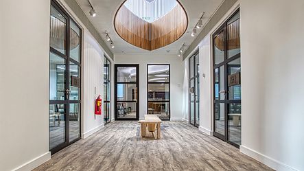 In addition to the fire doors, bespoke steel-framed Schüco Jansen glazed screens with arched tops enclose some of the rooms without blocking light.