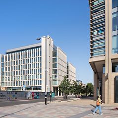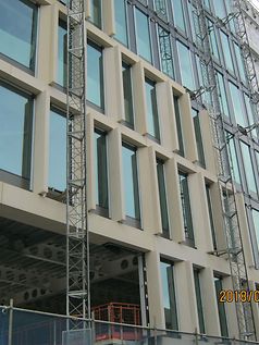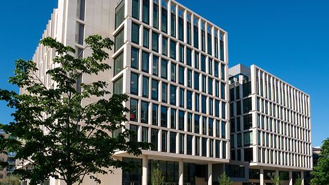 The distinctive façade incorporates multiple elements, including vertical fins, horizontal brise-soleils, glass-reinforced concrete (GRC) cladding, Schüco FW 60+ curtain walling and Schüco ADS 70 doors.