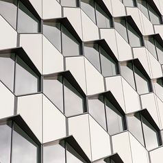 The ground floor uses a double-height curtain wall facade with a fully glazed colonnade that cuts through the building to improve access. The upper floors employ a striking “honeycomb” facade consisting of hexagonal curtain wall and rain-screen panels.