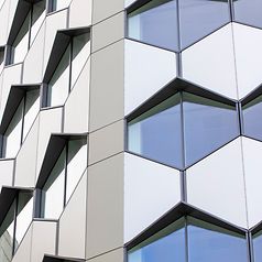 The hexagonal panels were constructed from naturally anodised aluminium and pre-treated using varying levels of gloss coating. This ensured that each left and right-hand panel has a different finish, resulting in an eye-catching multi-tone effect. Above each vision area of glazing is a feature hood. Designed to accept a potential access load, these items incorporate highly engineered brise-soleil brackets and internal carcass frame reinforcement – all of which are supported from the FWS 50 frame.