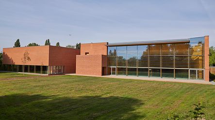 The main entrance to the new sports centre features a double-height curtain wall with very large opening windows and glass-to-glass corner connections. Powered doors were integrated into the curtain walling using the Schüco GTF (Ground Floor Treatment) 50 system which comprises a pivot door and screen. This system is designed to meet the rigorous demands of high traffic entrance areas and has integrated anti-finger trap technology.