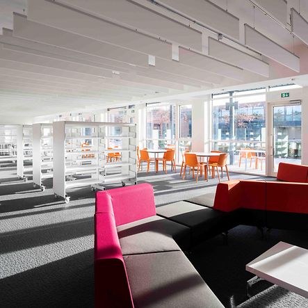 Brise soleil are provided by a large two-storey colonnade at the entrance, as well as building canopies and semi-mature trees. High-performance solar control coatings and internal anti-glare blinds are also utilised to avoid overheating and glare.