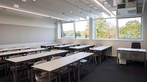 Bays of Schüco FWS 50 curtain walling, employed in bays across two floors, reduce interfaces between different wall materials ensuring airtightness is maintained. The bay windows also serve to illustrate the design ingredients of the building behind the façade. The structure, services, environmental design and type of teaching space are all represented with the placement and selection of different façade components.